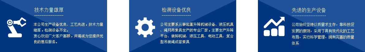 本公司系從事起重升降機械設備、液壓機具、繩網(wǎng)吊索具生產的專業(yè)廠家,主要生產千斤頂、液壓拉馬、軸承加熱器、升降平臺、裝卸機械、液壓工具、電動工具、復合型吊裝繩成套索具、高強纖維柔性吊裝帶、起重鏈條成套索具、橫梁吊具、注塑繩、軟梯、安全帶、安全網(wǎng)等幾大系列、上百種規(guī)格的產品,廣泛應用于電力、油田、大型鋼廠、機電、化工、航空、冶金、機械、鐵道、造紙、港口、建筑等領域。